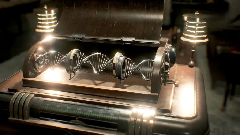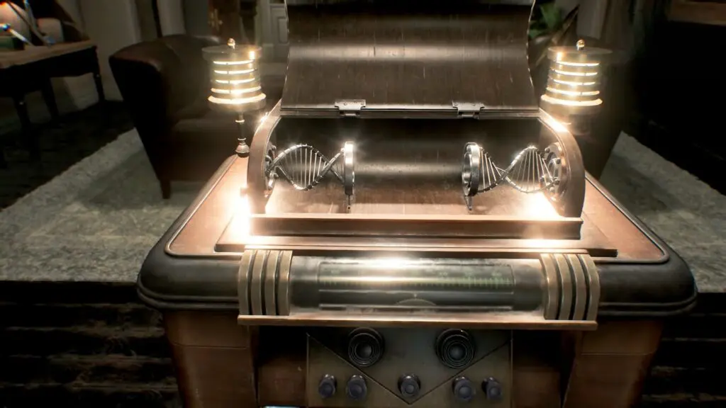 Now, go to the center of the room, where you will see a pedestal. Interact with it to open a hidden compartment. Inside, there is a DNA-shaped device with a section missing. Select the Double Helix Model from your inventory and place it into the empty slot.