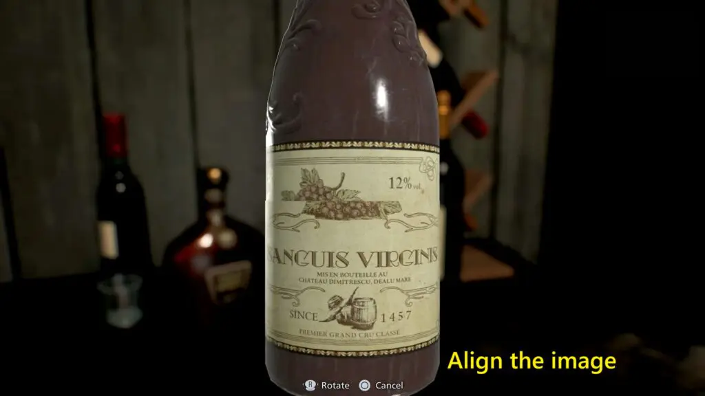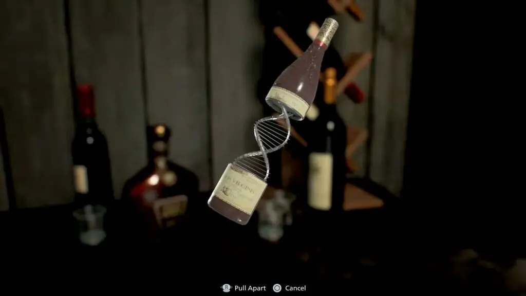 Rotate the upper portion of the bottle slowly until the label lines up perfectly with the lower half. The grapes on the label should form a complete image. When aligned correctly, the bottle will open and reveal a hidden item inside called the Double Helix Model.