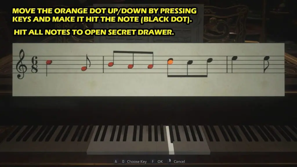 How to Solve the Piano Puzzle: Resident Evil Village | Iron Insignia Key Post published:May 8, 2021 Post category:Resident Evil 8 Village Piano Puzzle Solution: Resident Evil 8 Village (Iron Insignia Key) Piano Puzzle: Head to the Courtyard and enter the door on the north side using Dimitrescu’s KeyFind the piano in the Opera Hall in Dimitrescu Castle on 1FPress any key to get an orange dotMove the orange dot up/down by pressing keys (A and D), and make it hit the Note (Black dot)Hit all 10 notes to open the secret drawerThe reward for completing the piano puzzle is the Iron Insignia Key RELATED: Resident Evil 8 Village Guide