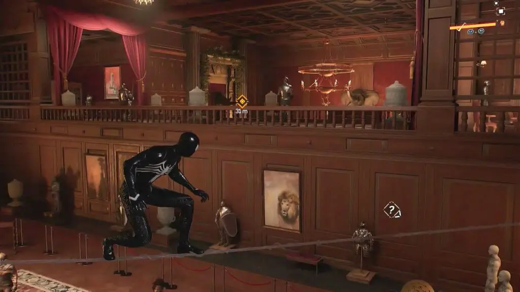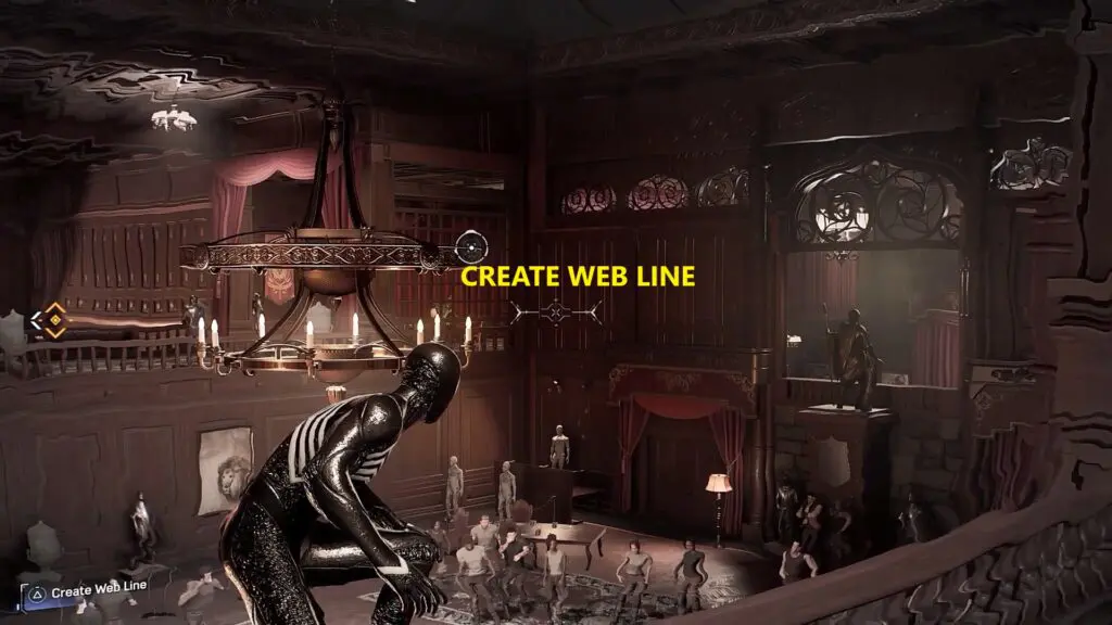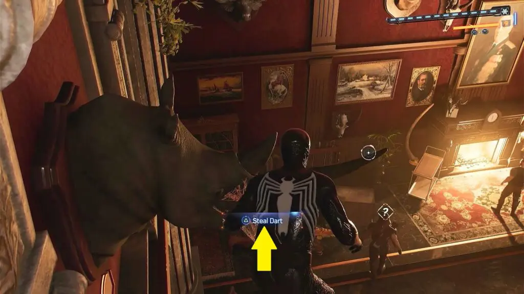 Create another Web Line to go to the other side as shown in the picture below. Create a web line to reach the Rhinoceros head. Shoot webs to distract the guard standing there. Then press the triangle button to Steal Dart as shown in the second picture below.