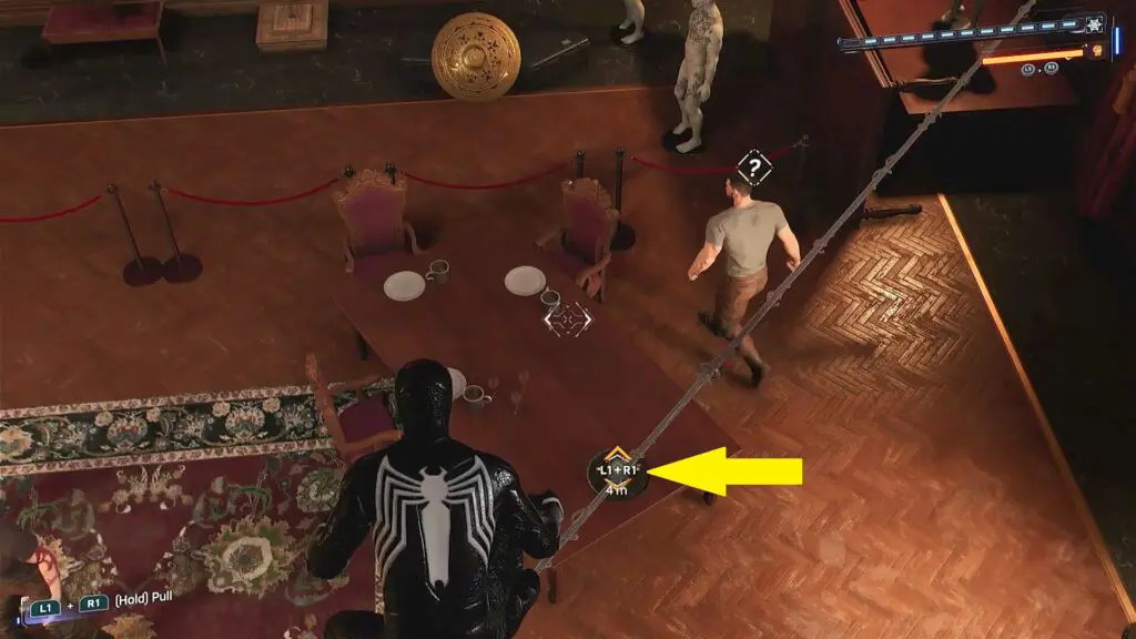 Aim across the room and press the Triangle button to create a web line as shown in the pictures below. Many players are facing a bug, in which the cursor appears green on the wall and they are unable to create a web line. If you face this bug, then simply load the last checkpoint, which is only a few seconds back. Walk on the web line and stop on top of the Raw Meat. There is a guard standing there, and you need to distract him to get the Meat. Shoot webs on one of the shields, which will distract the guard and make him walk away. Then Press L1+R1 to get the Raw Meat.
