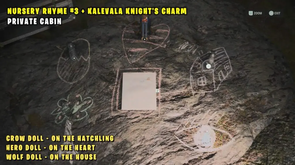 To complete the Nursery Rhyme Puzzle, put the Crow Doll on the Sun icon. Afterward, remember to pick up the Crow Doll before moving forward. Collect Hammer Charm as a reward from the bench.