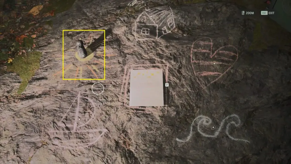 When you shine your flashlight on certain things, the numbers will light up: The note on the stash says the code is Rock-Rock-Tree