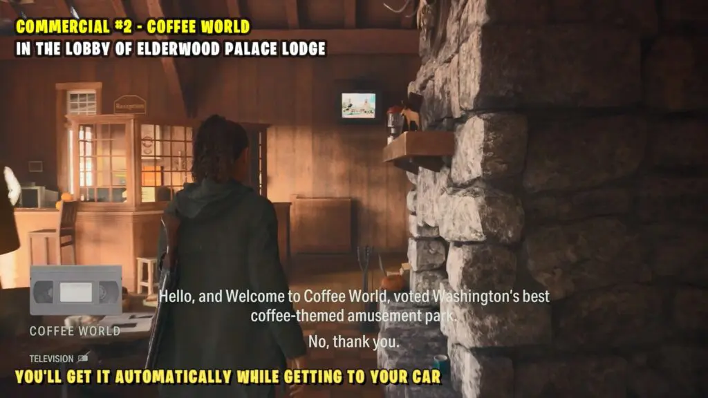 You will get Commercial #2 – Coffee World automatically while getting to your car. Look at the TV in the lobby of Elderwood Palace Lodge.