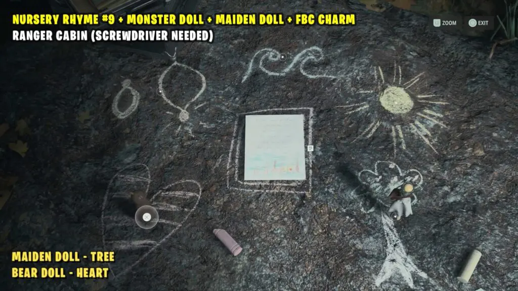 To solve Nursery Rhyme Puzzle #9, go behind the Ranger Cabin. Place the Maiden Doll on the Tree and the Bear Doll on the Heart.