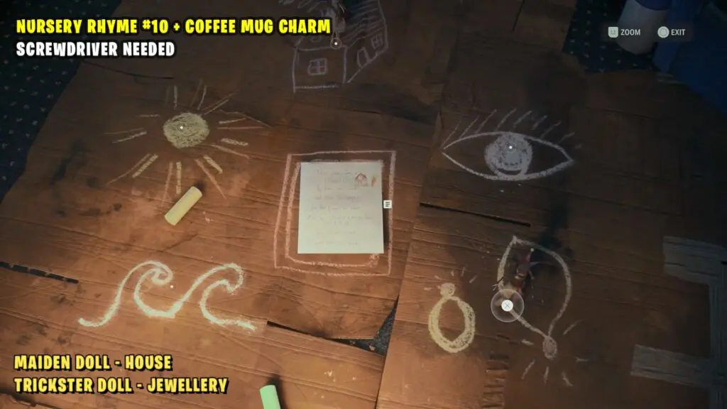 To solve Nursery Rhyme Puzzle #10, return to Watery. Unlock the building behind Suomi Hall using your Screwdriver. Put the Maiden Doll on the House, and the Trickster Doll on the Jewelry.