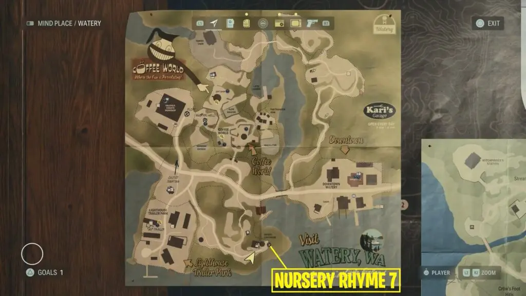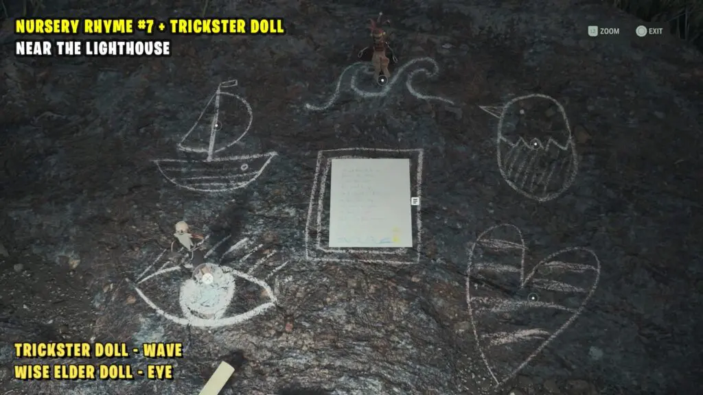 Nursery Rhyme is near the cliff. To solve the Nursery Rhyme Puzzle by the lighthouse, put the Trickster Doll on Waves and the Wise Elder Doll on the Eye.