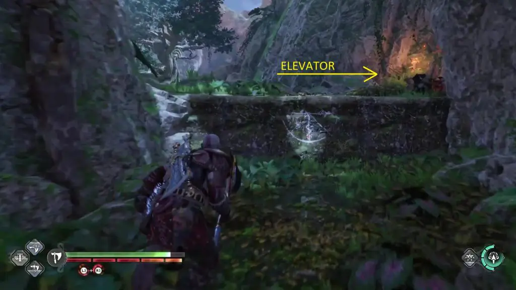 As the quest starts, go towards the dam wall. As you reach the wall, turn left and proceed straight ahead. Here you will find the elevator on the right side as shown in the picture below. The elevator will be blocked by some red vines. Burn the vines using your sigil arrows and blade. Then take the elevator to the top.