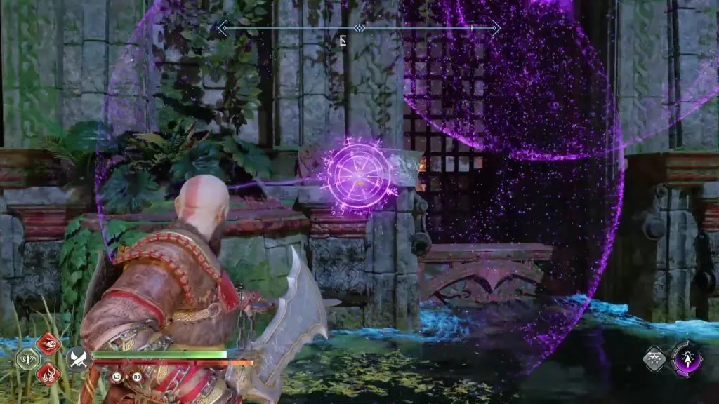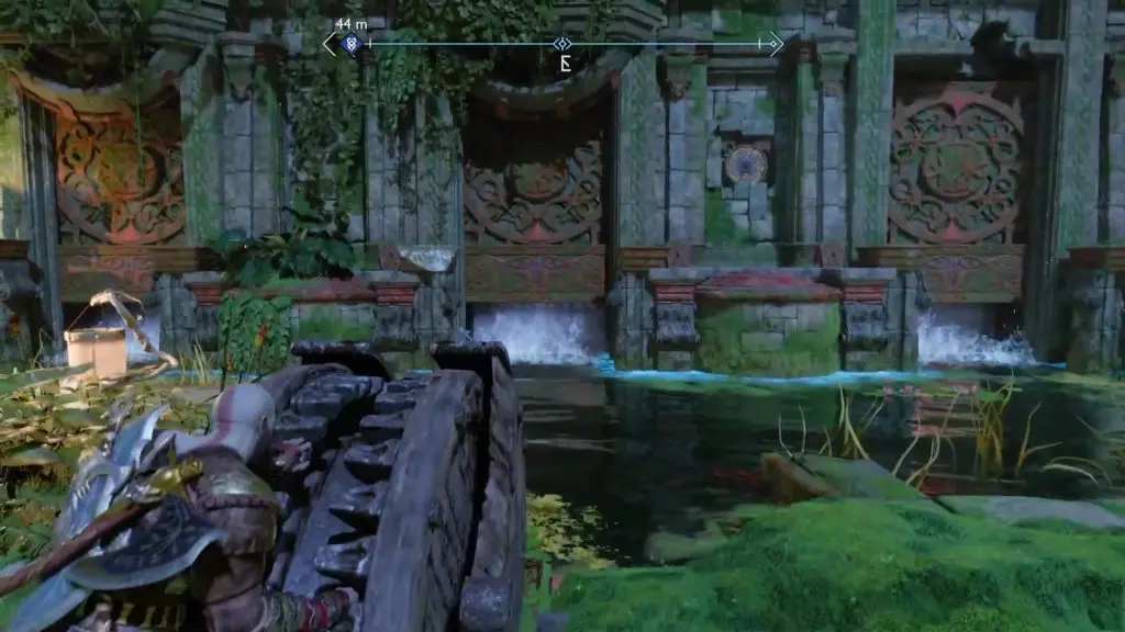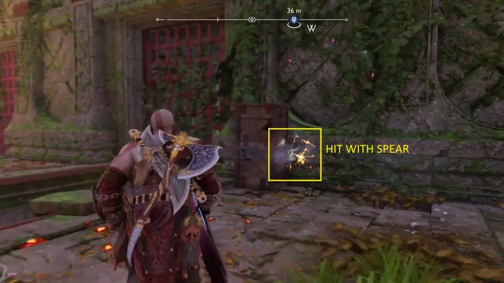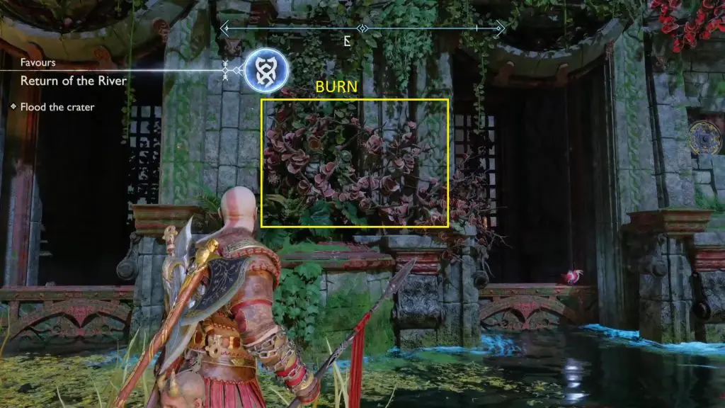 To flood the crater, you will have to raise the dam gates, for which you will need to burn the vines on the wall. Burning the left vine is very easy. Simply shoot it with sigil arrows and hit one of the arrows with your blade to cause an explosion, which will burn the vines.