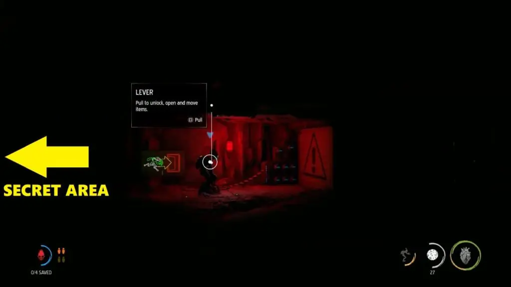 The first secret area is inside the cave. You will get the objective ‘Open the door from inside the cave’. You can find the secret area on the left side of the lever near the wall.