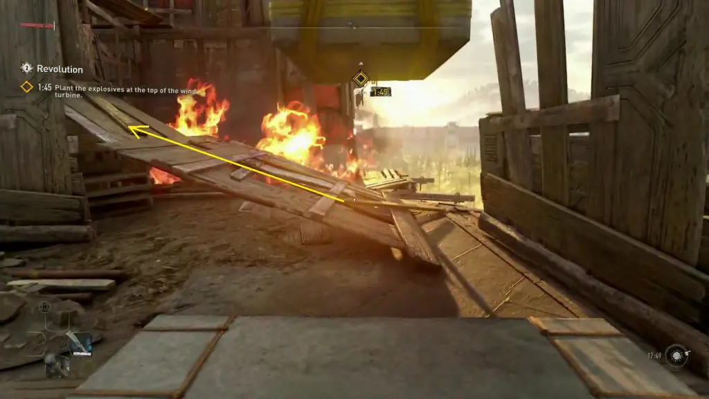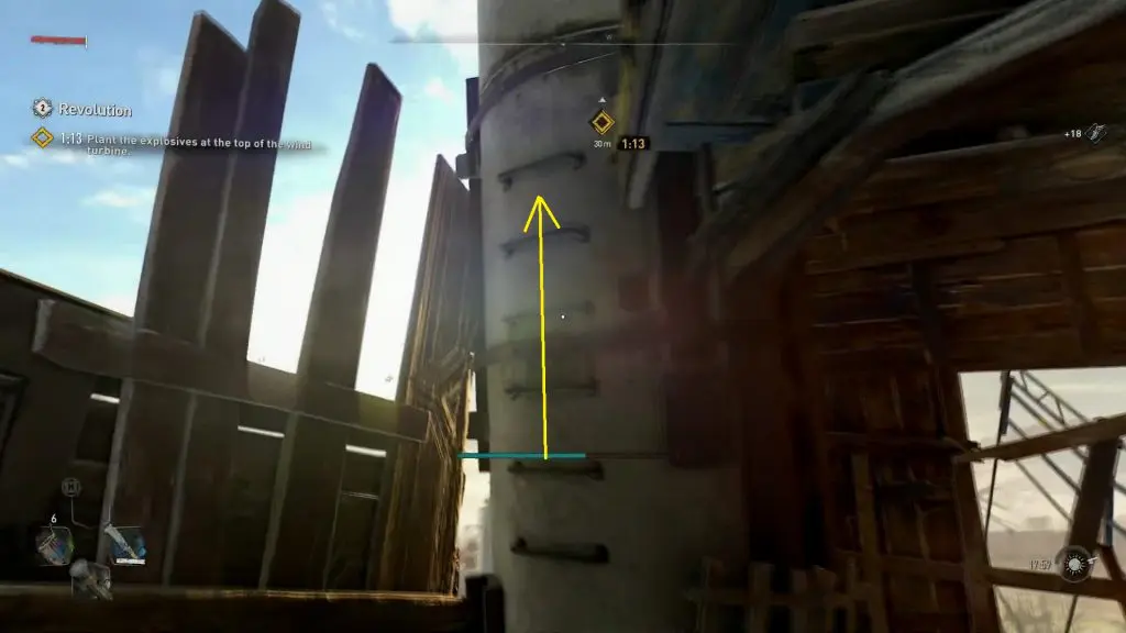 Climb the ladder inside the central pillar to reach the top of the windmill. Then plant the explosive as shown below to complete the objective.