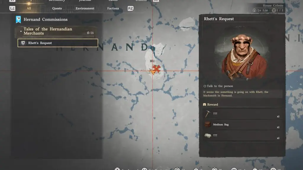 To start the quest, head to the City of Hernand and check the Notice Board. Look for Rhett’s poster on the Notice Board and read it. You will learn he needs quality ore. This will unlock Rhett’s Request and add it to your quest list.