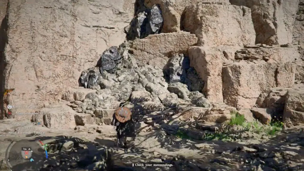 After accepting the quest, follow the marker on your map and head southeast of the town. Continue toward the marked spot until you reach the base of a large cliff, where you will find a patch of iron. Equip your pickaxe and start to mine the iron ore.