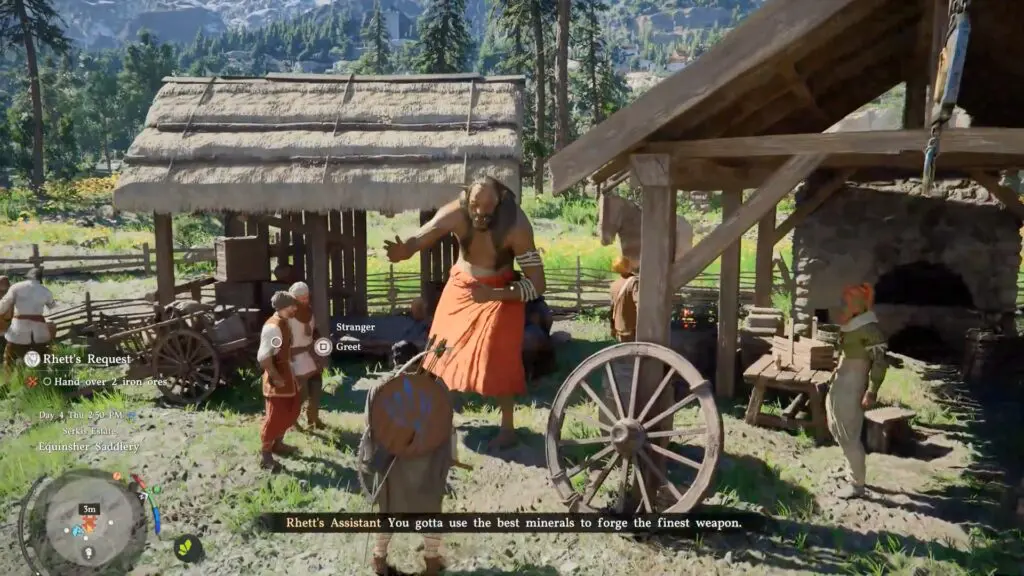 Once you mine the Iron ore, head to the updated quest marker to find Rhett’s assistant at a new spot. He had moved southwest from the mine. Approach him and hand over the 2 pieces of iron ore to complete the quest.