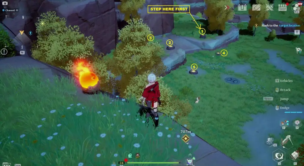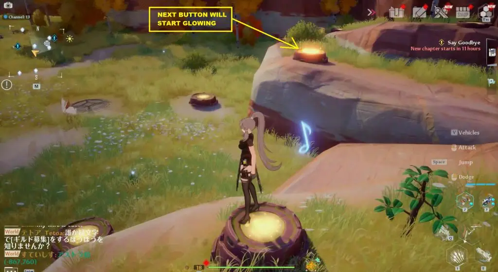 You will find many buttons on the ground in the Astra area at the location shown in the pictures below. Stepping on a button plays a music note. In order to solve this Ring of Echoes Puzzle, you will need to step on 5 buttons in a specific order. On solving the puzzle, a chest will spawn.