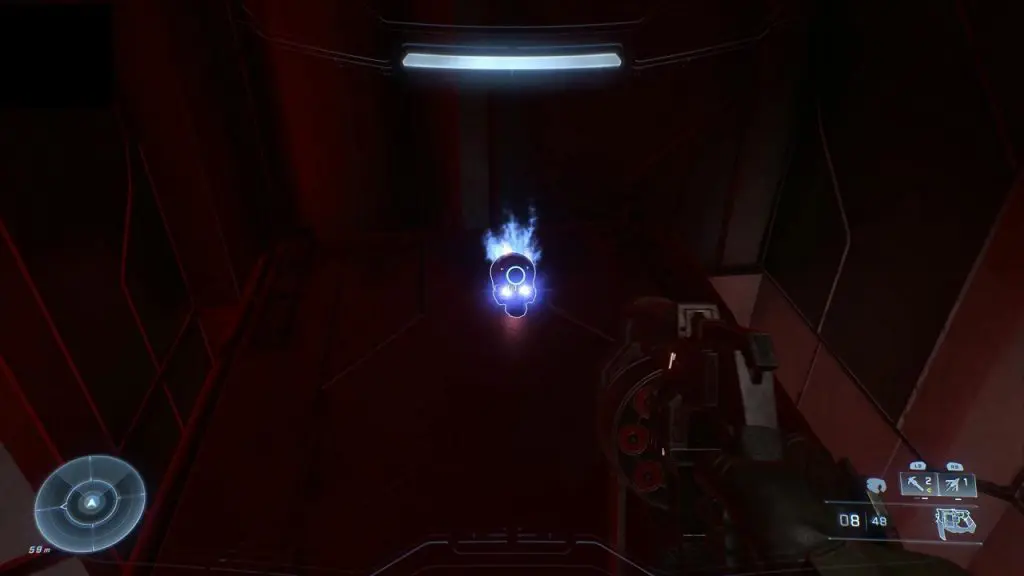 During the objective to ‘Locate the Bridge’, you will come to a room with three lifts moving banished crates up on the right side as shown in the pictures below. Get on the ascending crate in the middle to reach the upper level. Don’t get down on the upper level, and keep going up instead. As you go up, you will find a skull in a secret spot as shown in the third picture below.