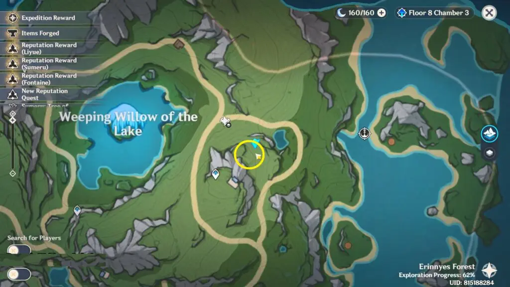 To find the treasure, Go to the ruined house east of the Weeping Willow Lake and attack the three trees nearby.