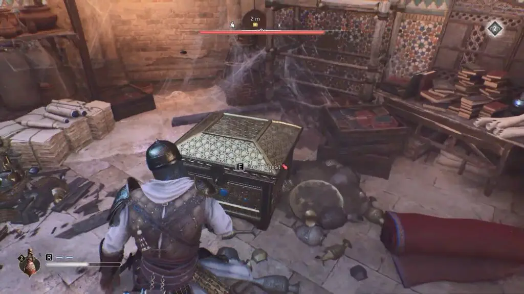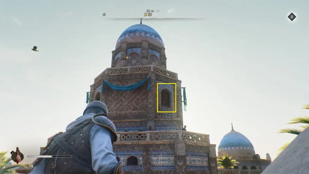 The first gear chest is inside the tower in Mazalim Courts. Destroy the breakable window by throwing a Throwing Knife at it.