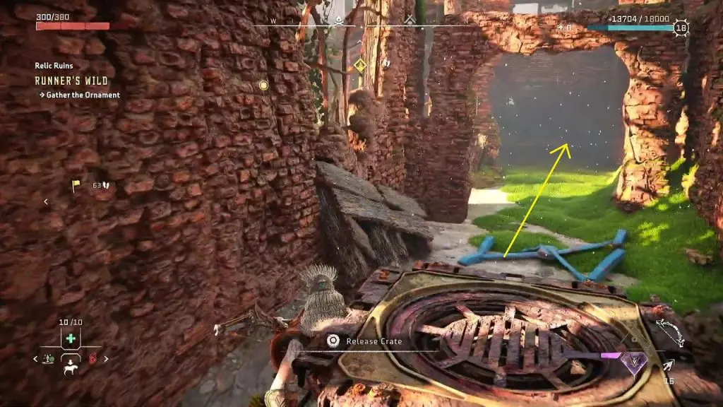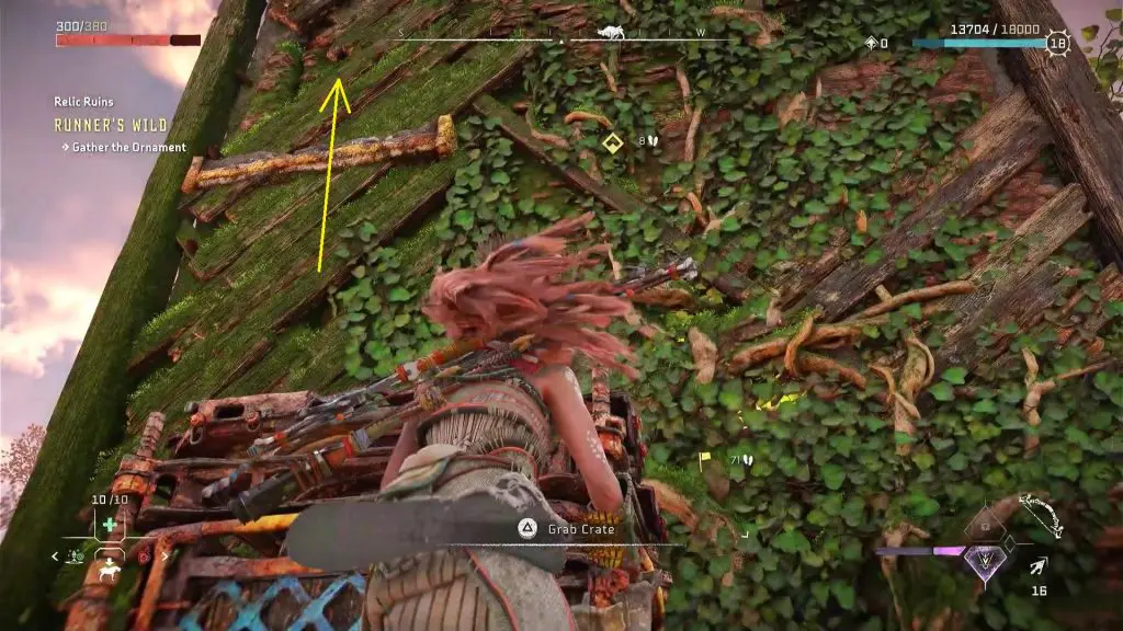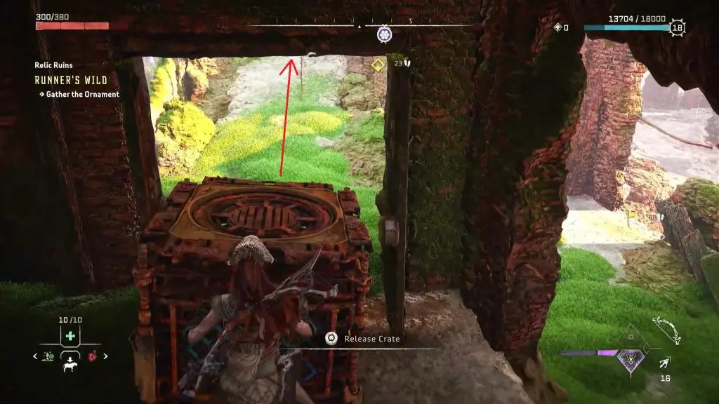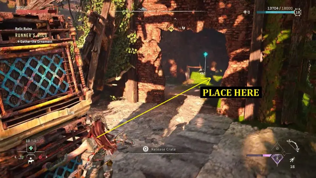 Place the crate underneath the ledge. Climb up the ledge to reach the top room of the tower, where you will find the ornament. Pick up the ornament to complete the relic ruin.