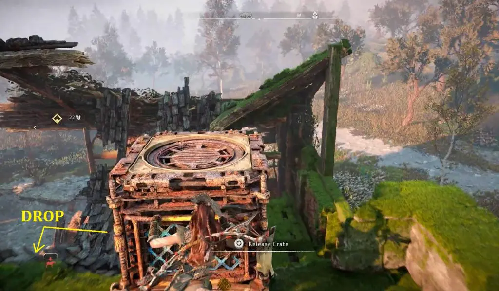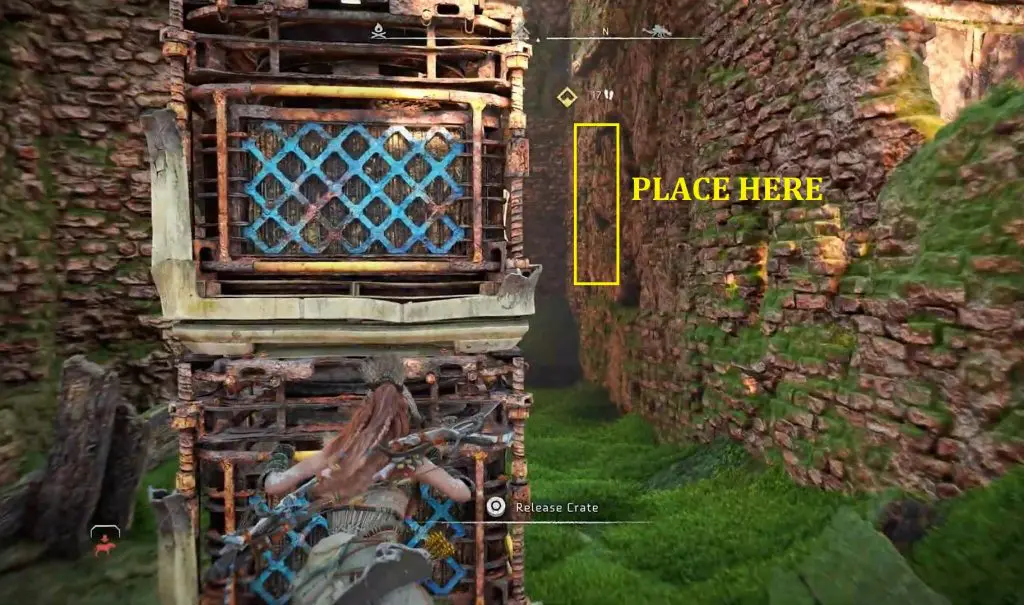 Then jump down and push the crates through the broken wall and place them under the ledge at the location shown in the picture below.
