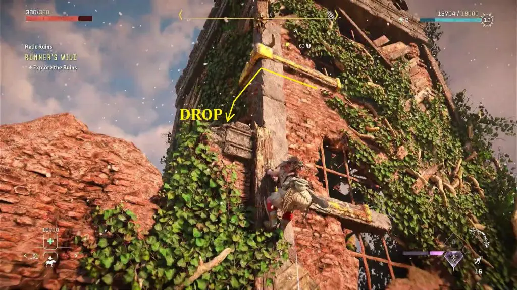 Then climb up the tower wall. Move on the ledge to go to the other side of the tower and then drop down as shown in the picture below.