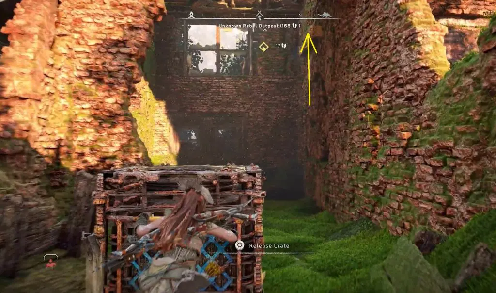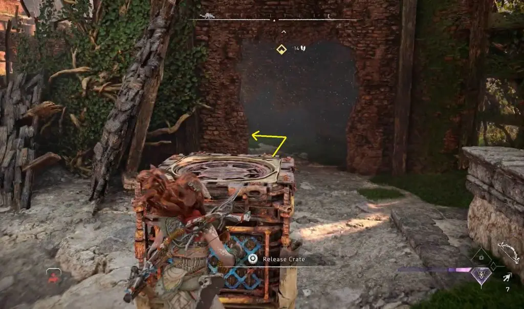 Break the wall ahead of you using the pullcaster. Then push the crate to the end of the path. Place the crate under a ledge as shown in the pictures below. Climb up the ledge to reach the roof.