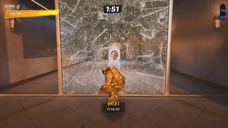 Grind the rail along the stairs to reach the top, where you’ll see the logo positioned behind a glass wall. Break through the glass to collect the logo.