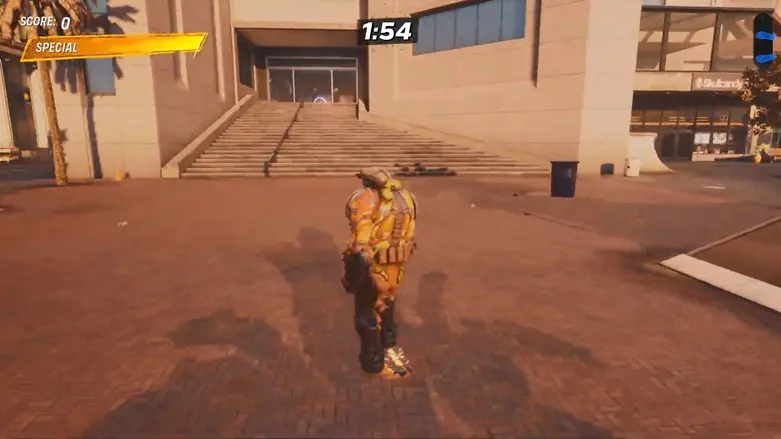 From the starting point, head toward the skate park, then turn around and face back toward the starting area. You’ll spot a long staircase leading up into a building on your right.