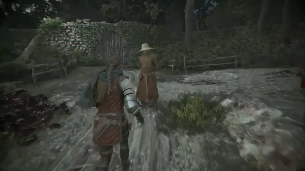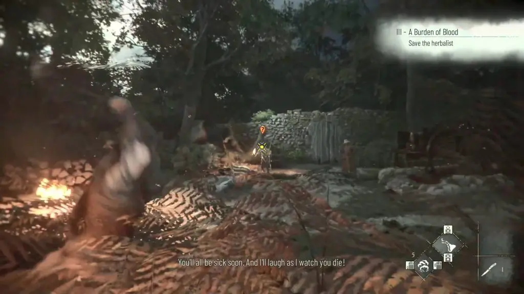 After you reach the end of the Reach the Herbalist’s Forest, you should notice three more people coming out a gate. One of them is in a robe, he’s the herbalist, and the other two are enemy guards.