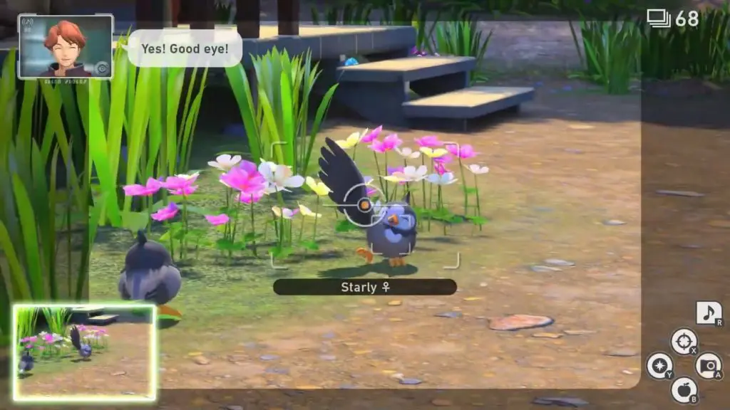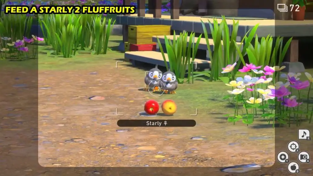 • After eating 2 fluffruits Starly will wave at you. Snap it waving at you to fulfill the request.