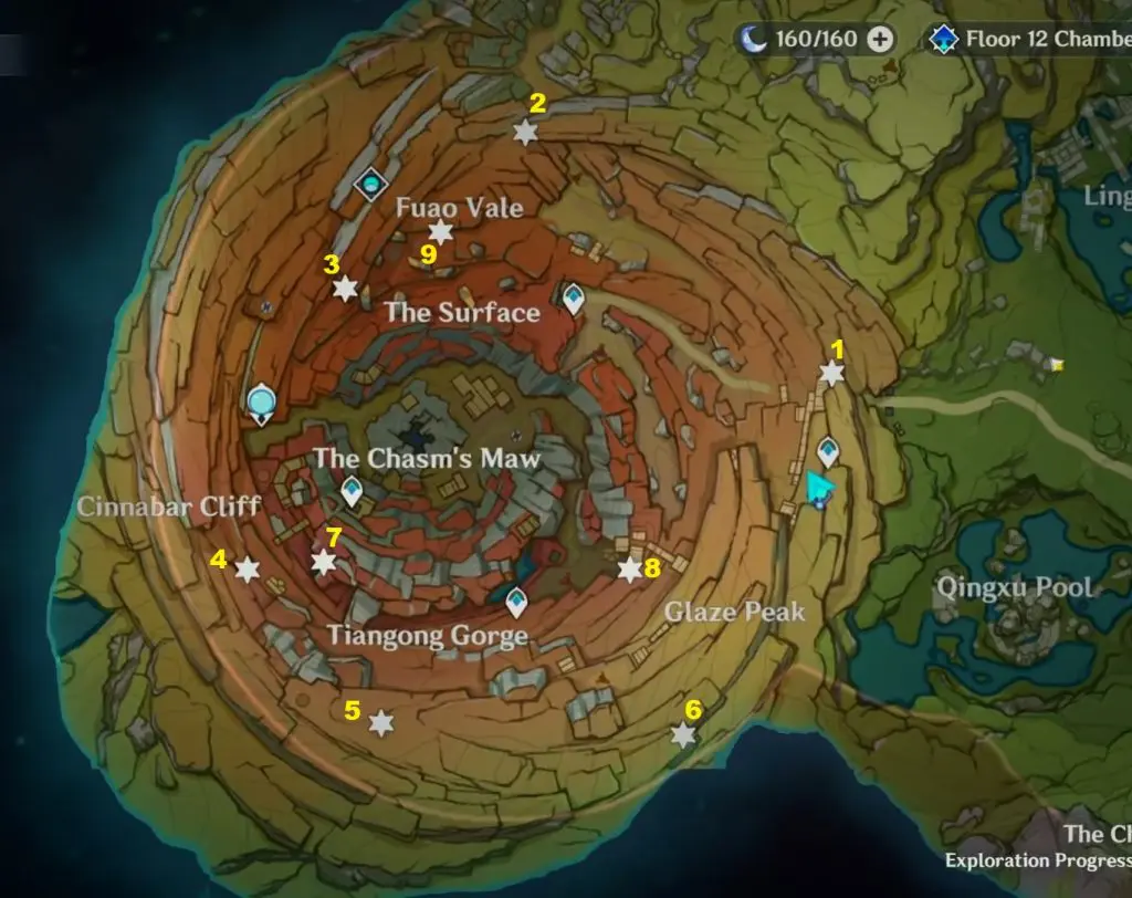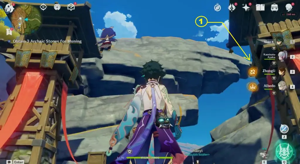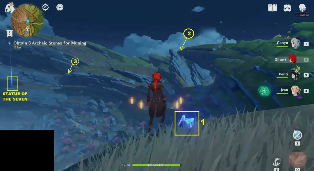 After collecting Archaic Stone #1, continue ahead on the top of the mountains to get Archaic Stones #2 & #3 on the edges as shown in the picture below. Click here to see how to get all 9 Archaic Stones in Chasm. Give three Archaic Stones to Muning to complete the quest and get 20 Primogems. If you give the rest of the Archaic Stones to Muning, you will receive 40 more Primogems.