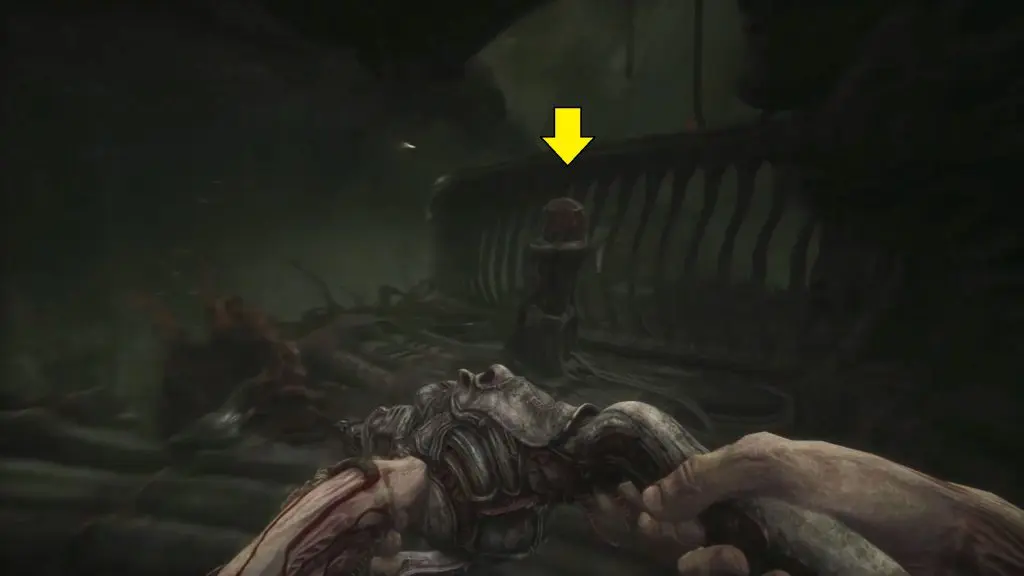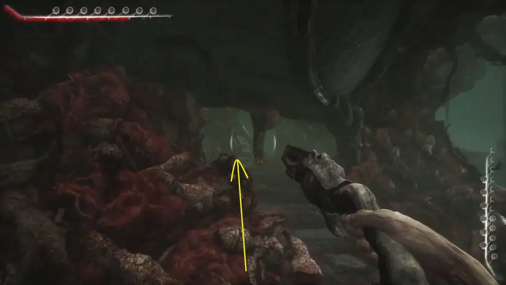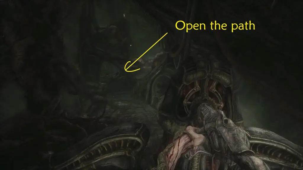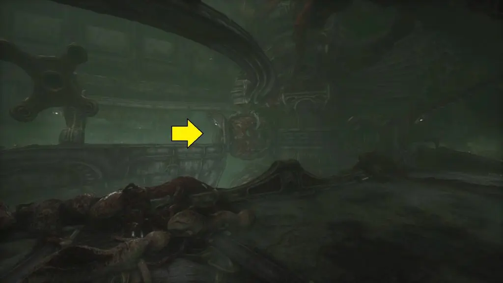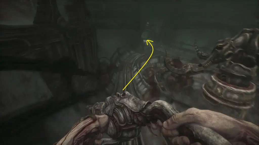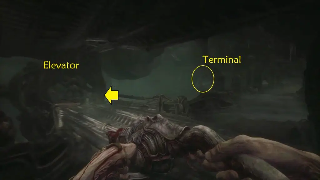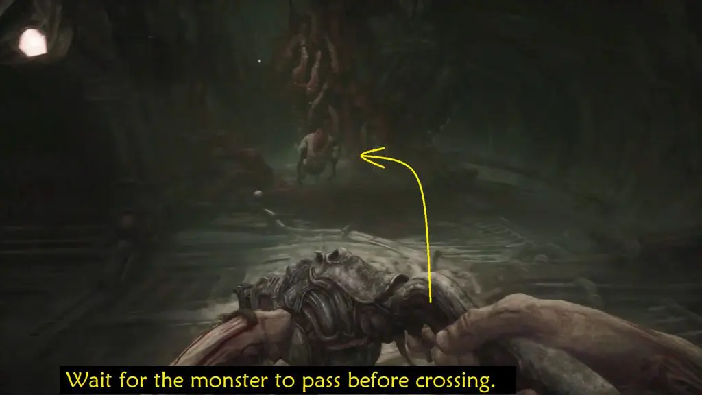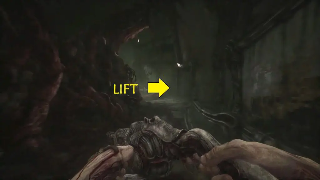 Wait for the big monster to pass. When you have enough room, move around it and then turn left to get to the elevator. Act 3 of Scorn is completed by using the elevator.