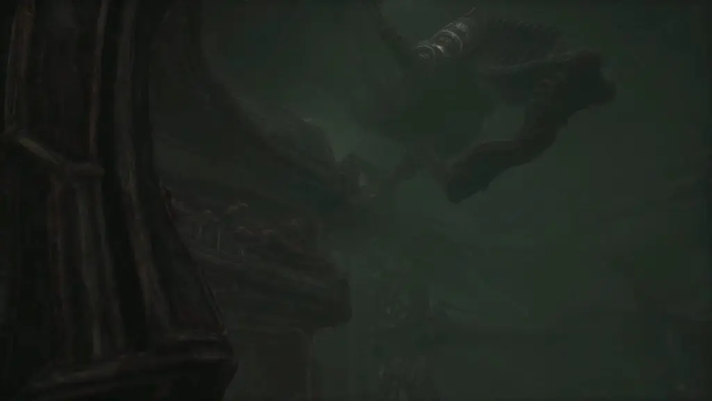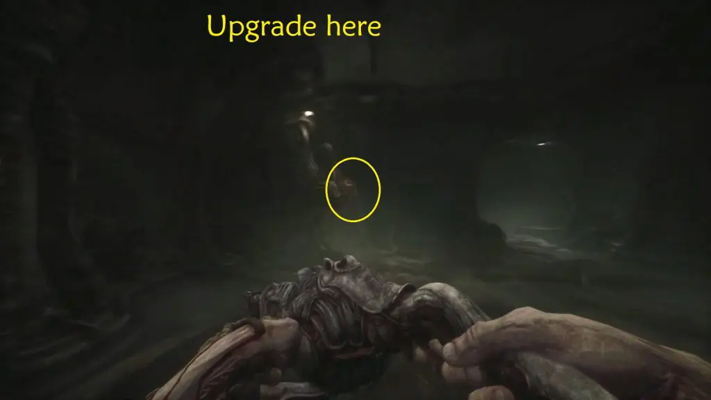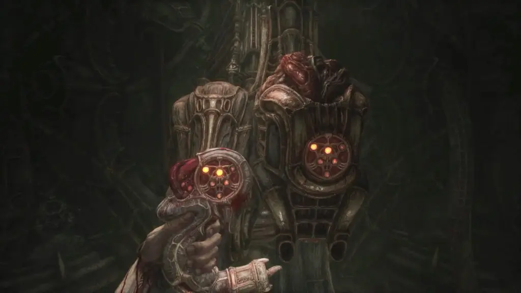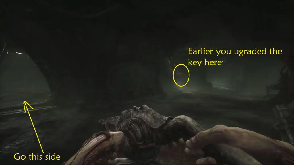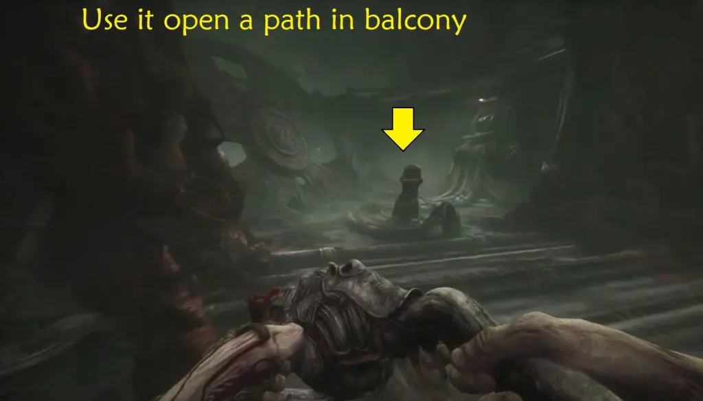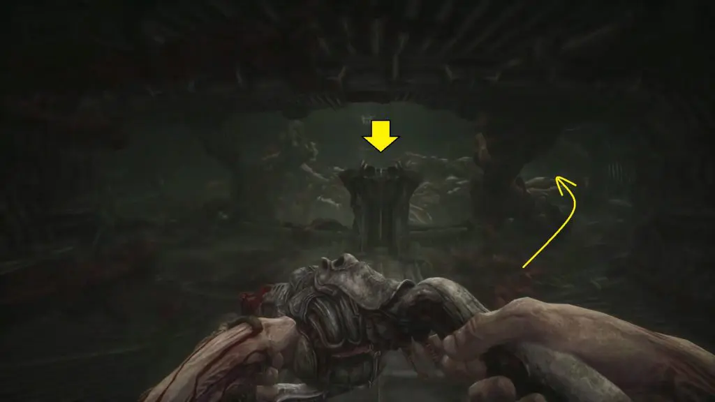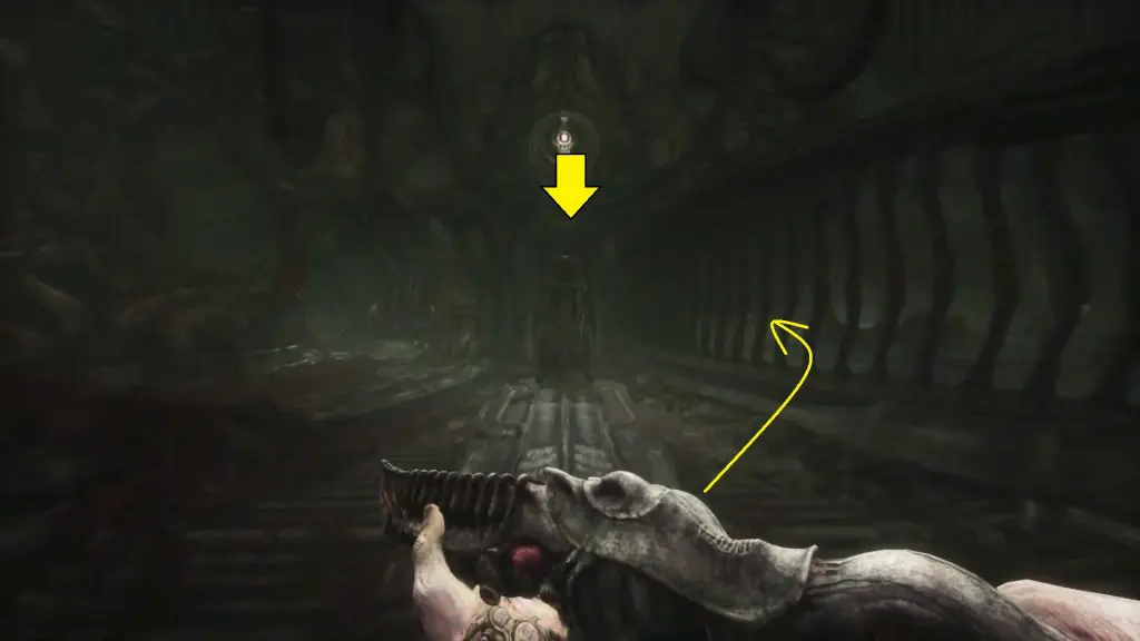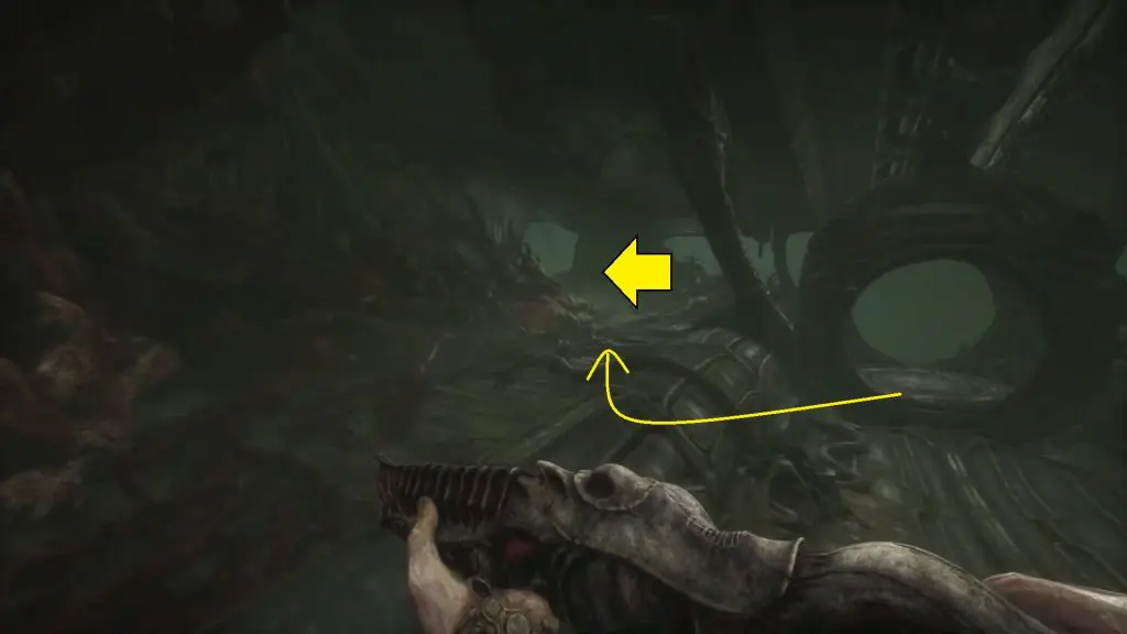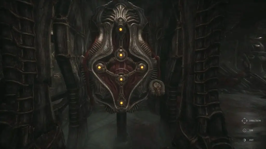 Wait for the big monster to pass. When you have enough room, move around it and then turn left to get to the elevator. Act 3 of Scorn is completed by using the elevator.