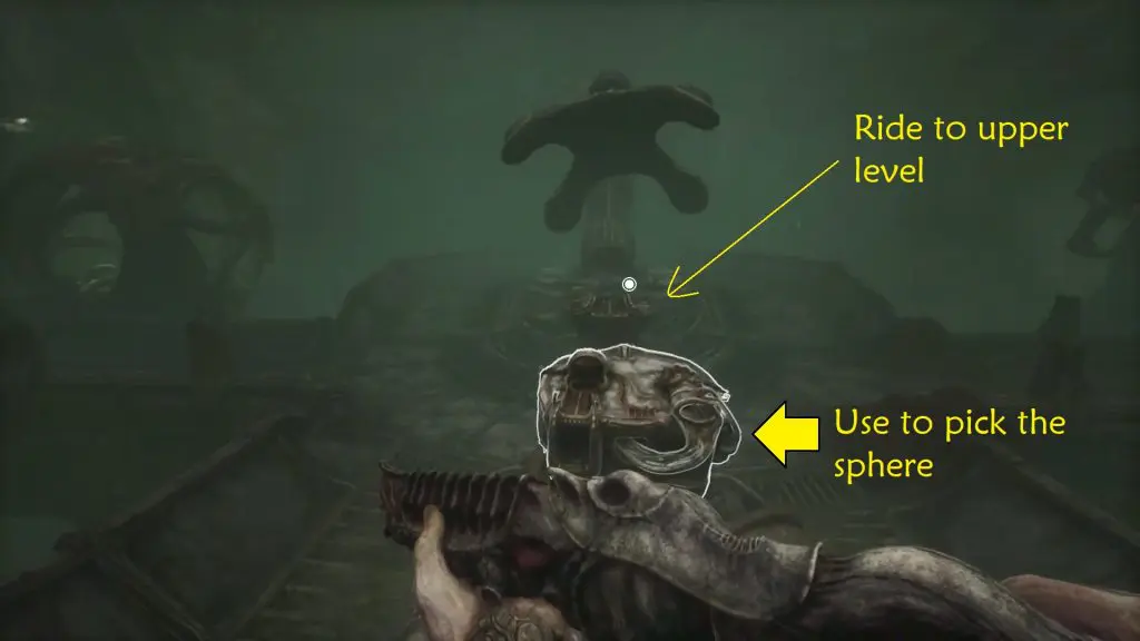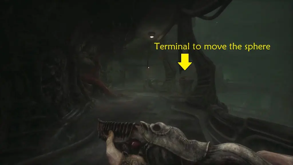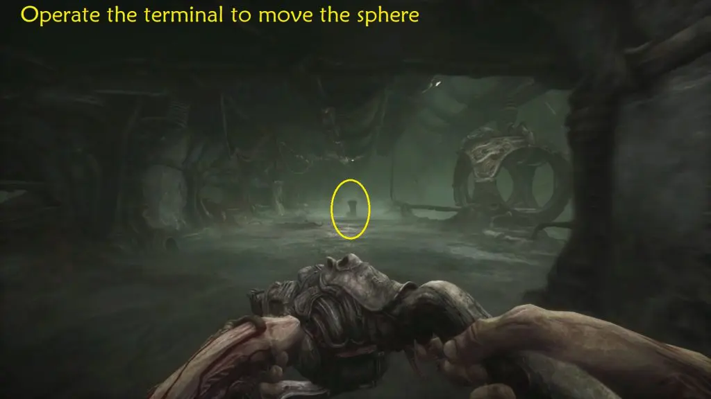Next, head to the control terminal located on the balcony to the left of the elevator. Use it to mount the sphere onto the hook and transfers it near the main elevator.