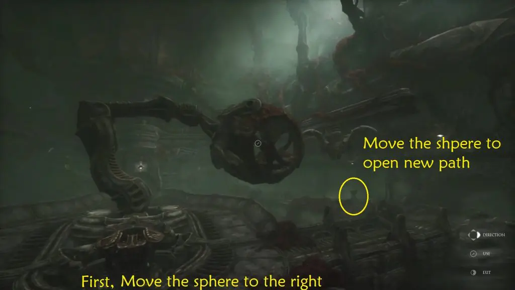 After a bit of walking pass, you will reach an area with a large sphere. Use the terminal to move the sphere to the other side. Ride the sphere to cross.