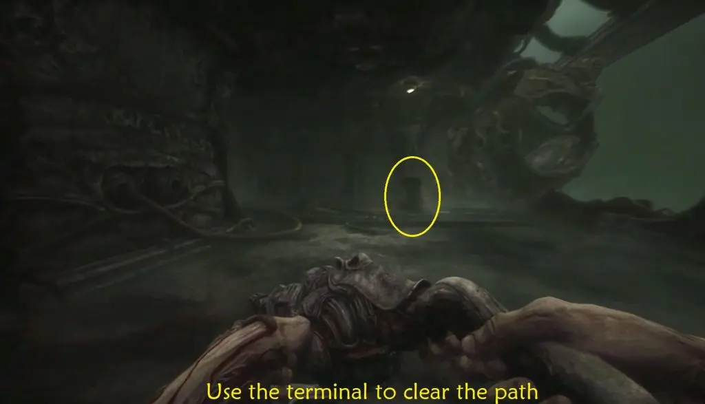 Take the path leading down to reach a terminal and then turn right. Interact with it to release the trapped spherical from the depths.