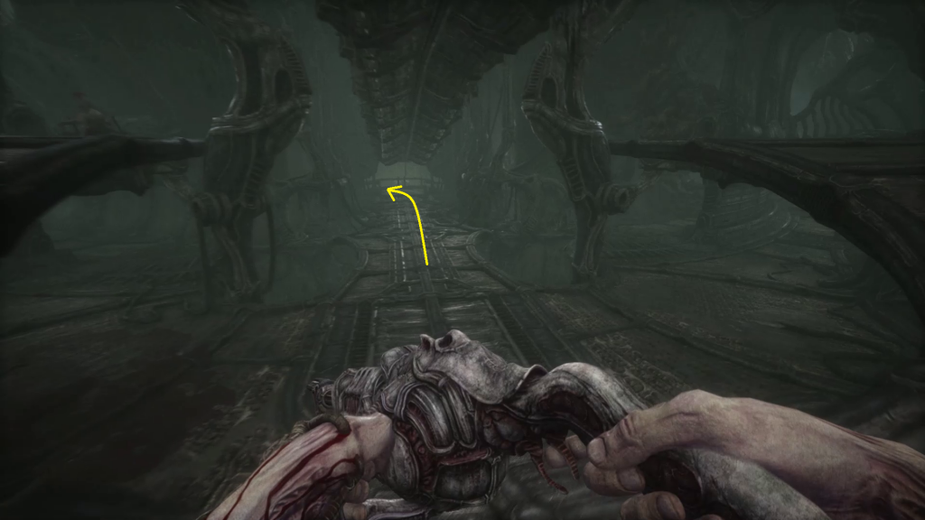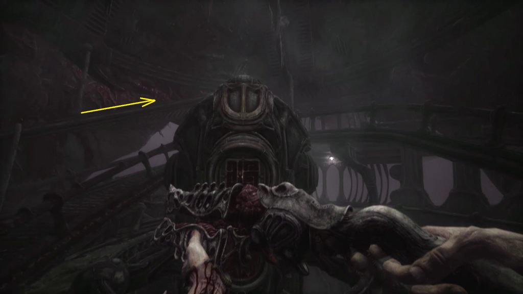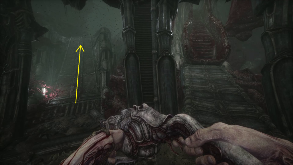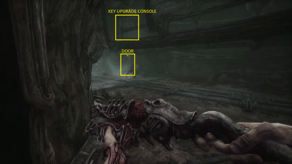 Now come out of the room and take the path going left. It will take you to an elevator. You will find a chicken monster on the path, which you can easily run past of. Take the elevator to reach the upper level and then proceed ahead in the linear path. It will lead you to a hall as shown in the picture below. Go to the upper level of the hall and use the console to upgrade your key. Then climb down and use the key on the door as shown in the picture below.