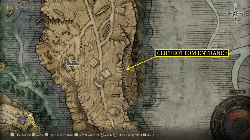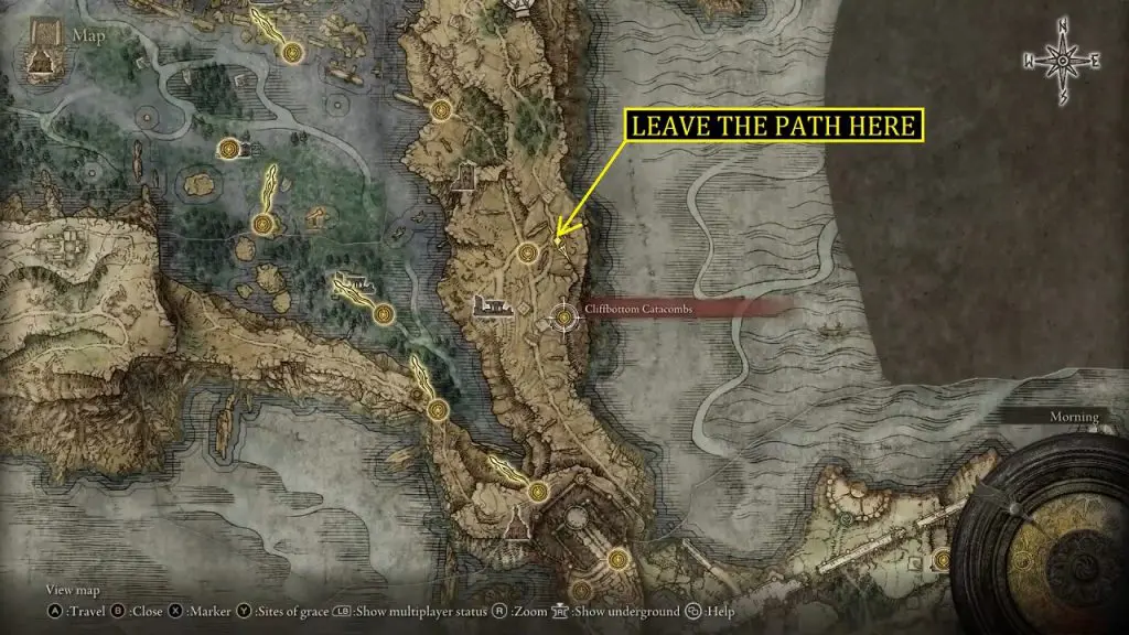 To reach Cliffbottom Catacombs entrance, leave the path and go southeast on the cliffside as shown in the pictures below.