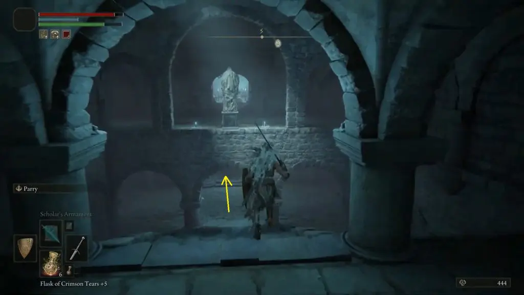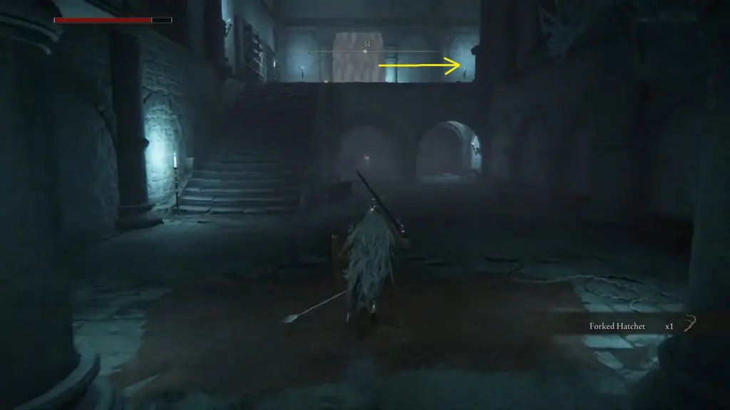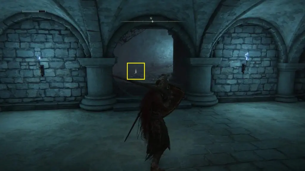 Climb another set of stairs and proceed straight ahead. Here you will have another trap in the path, so be cautious. Continue ahead and you will reach a room with a corpse inside, with a Scythe on it as shown below. Entering the room will trigger a trap that will fire three sets of arrows. Use a shield or dodge the arrows quickly. Then collect the Scythe. Click here for the complete walkthrough of Cliffbottom Catacombs.