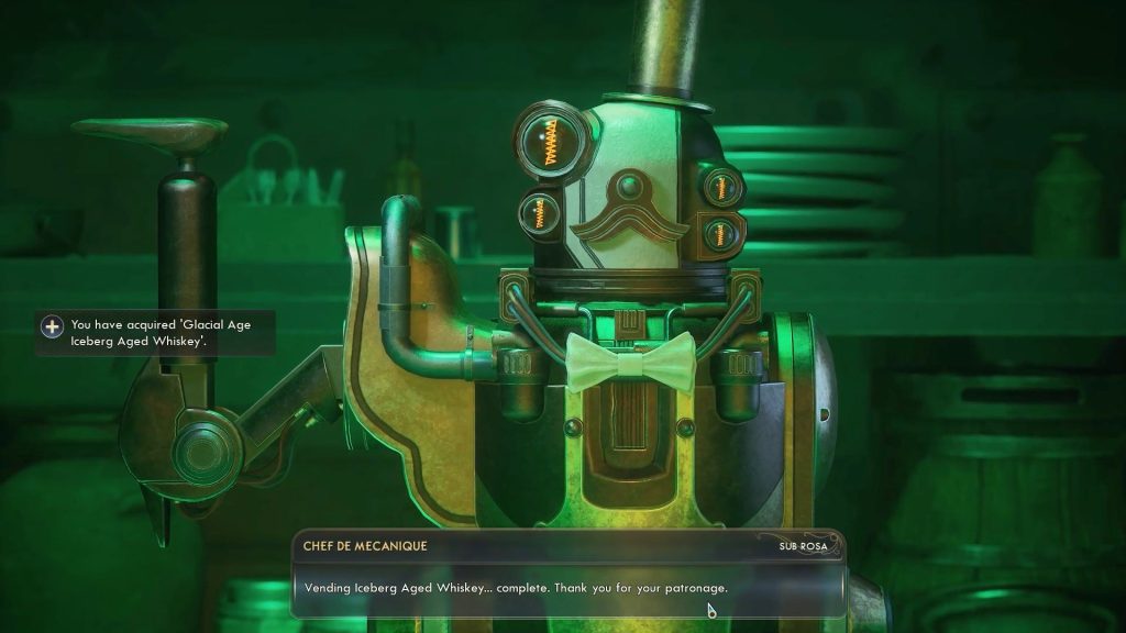 Leave the Second Choice and head to the outdoor bar on the opposite side of the bazaar, where you will find the bar operated by a robot named Chef de Mechanique.