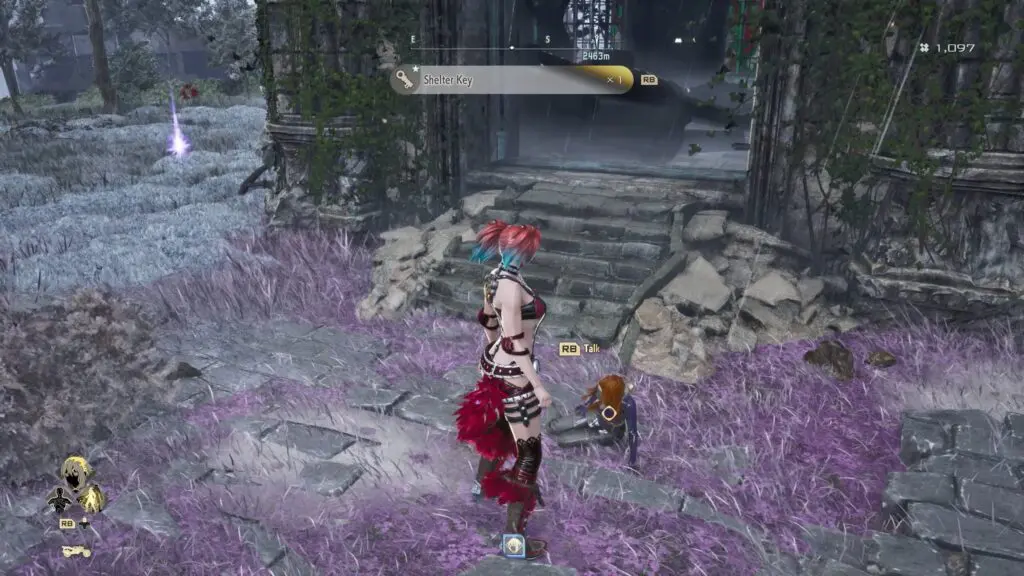 From this Mistle, look toward the southeast and follow the path in that direction. Follow the path uphill to reach a building. When you reach the top, you will see a woman sitting outside the building. Approach her and start a conversation. During this interaction, she will give you the key to the shelter.