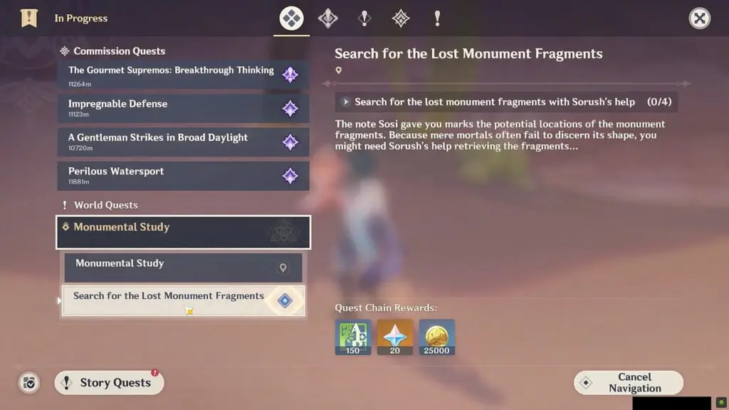 This guide shows how to complete the Search for the Lost Monument Fragments World Quest in the Sumeru region in Genshin Impact 3.6. You are required to complete this quest in order to finish the Monumental Study World Quest. You will need the Sorush gadget to see the lost monument fragment and collect it.