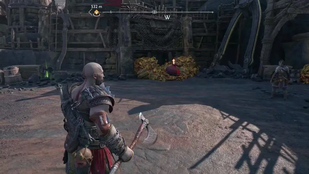 After opening the gate, proceed ahead and soon you will get a cutscene with Sindri. After the cutscene, you can proceed straight ahead and enter the mines. But before entering the mines, you can go right and find the legendary chest to get an attachment for your blade.