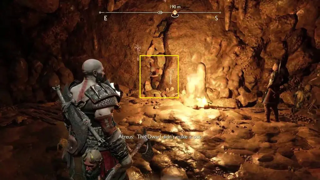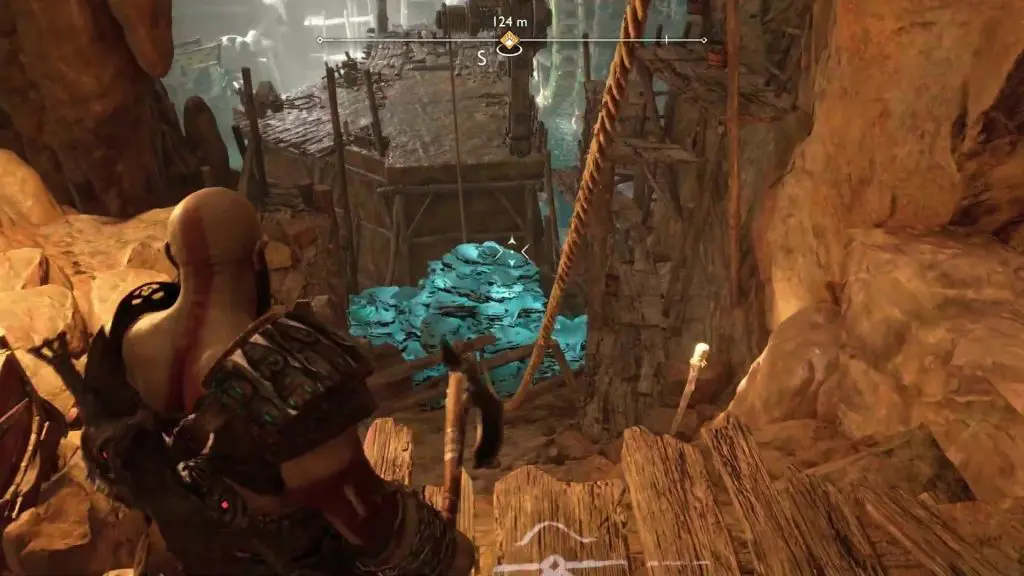 Enter the mines. Then turn left and drop down. Here you will find some sound stones blocking the tunnel as shown in the picture below. Direct Atreus to destroy the stones and go through the tunnel. After coming out of the tunnel you will find yourself in a giant hall. Defeat the enemies there and then hop into the boat there for a short ride to the next area.