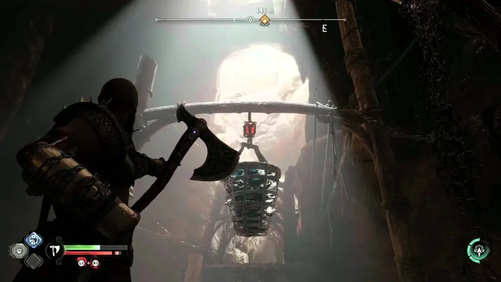 After coming out, go left and direct Atreus to destroy the sound stones hanging from the hook as shown in the picture below. Use the hook to jump to the other side.