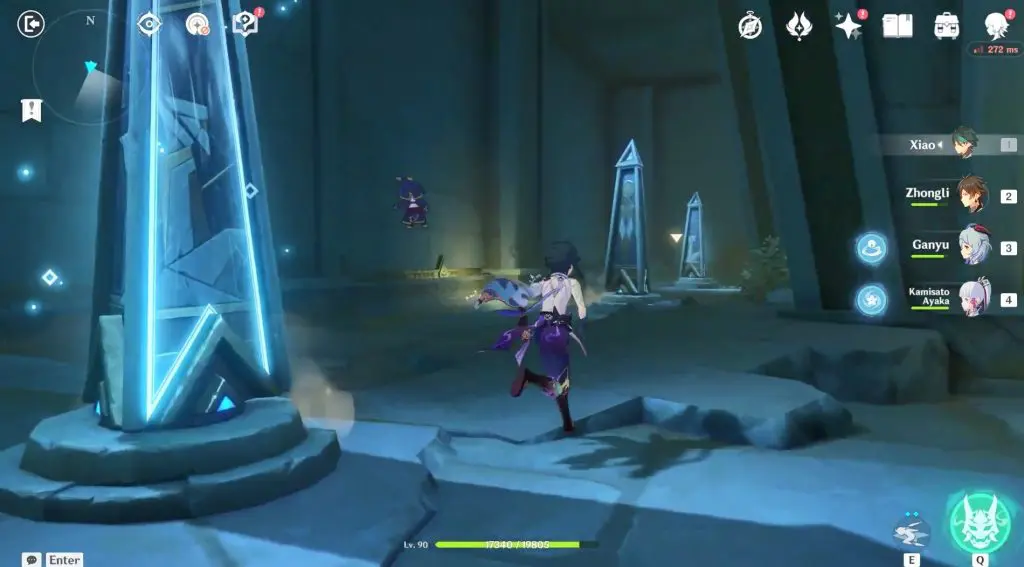 Three pillars can be found inside the ruin. Rotate each pillar until it resembles the figure (picture in sitting position) in the reference image. The pillars will also begin to glow blue to signify their proper location. You can begin from the left pillar. When all of the pillars have been correctly rotated, an elevator will appear in the center of the room. Step aboard the elevator and interact with it, prompting it to activate and transfer you to a lower floor.