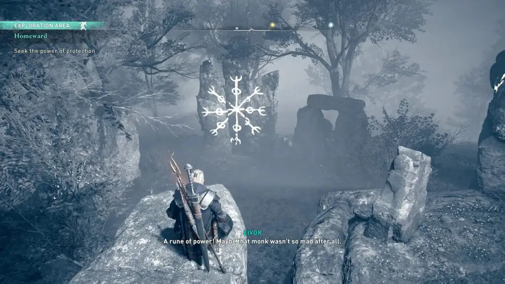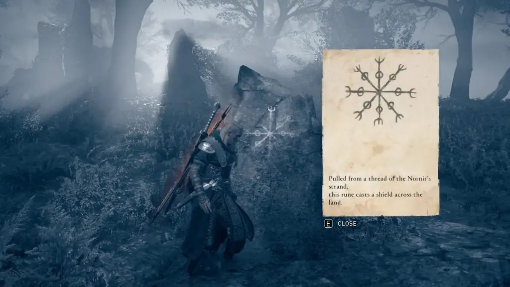 From the Mad Monk’s Camp, go in the northeast direction. Use Odin’s sight to guide you. As you go in the northeast direction, you will see a rock with a symbol drawn on it as shown in the picture below. A note on the rock reads: Pulled from a thread of the Nornir’s Strand, this rune casts a shield across the land.