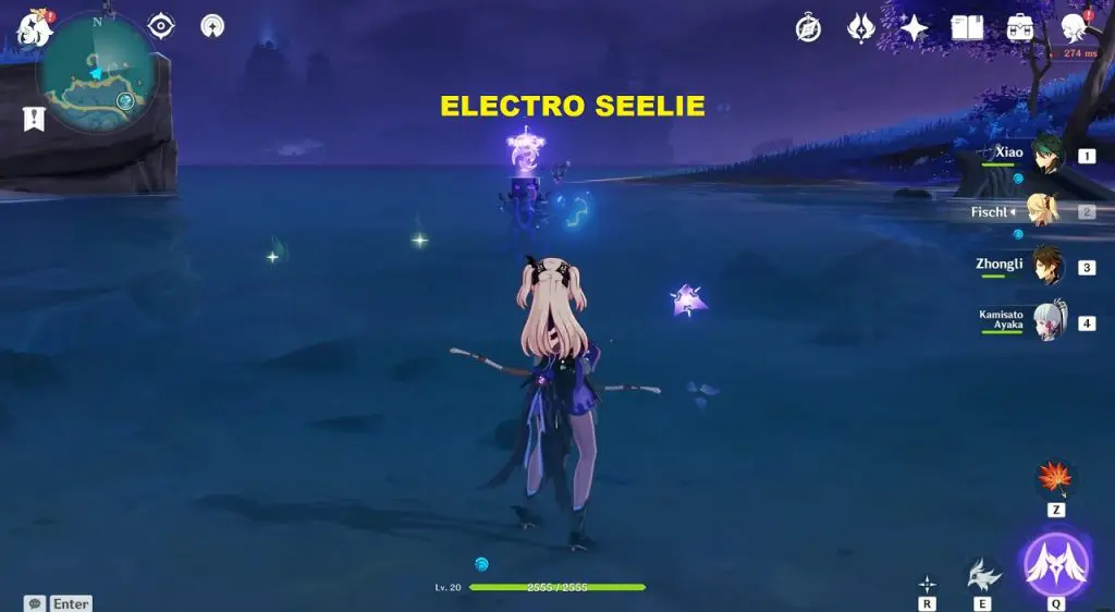 There is a 5-Probe puzzle on the beach north of Koseki Village. At the center of the five probes, you will see an electro totem (see the second picture below). Hit the totem with electro attack and Electro-Seelie will appear at its to (see the third picture below). Use the Electro-Seelie to get charged and activate the probes. When all the five probes are activated simultaneously, a precious chest will span.