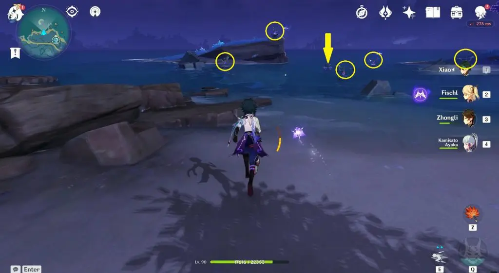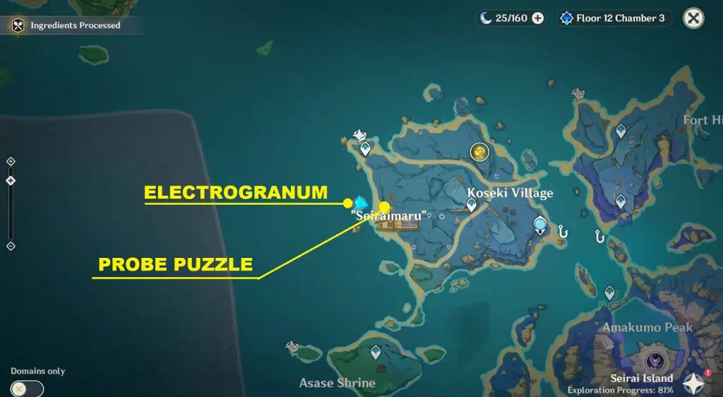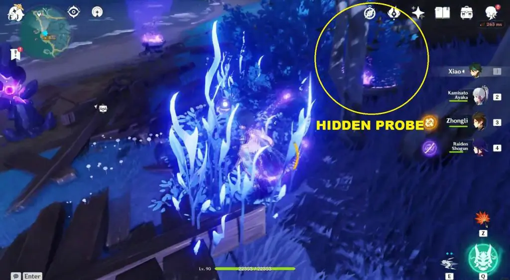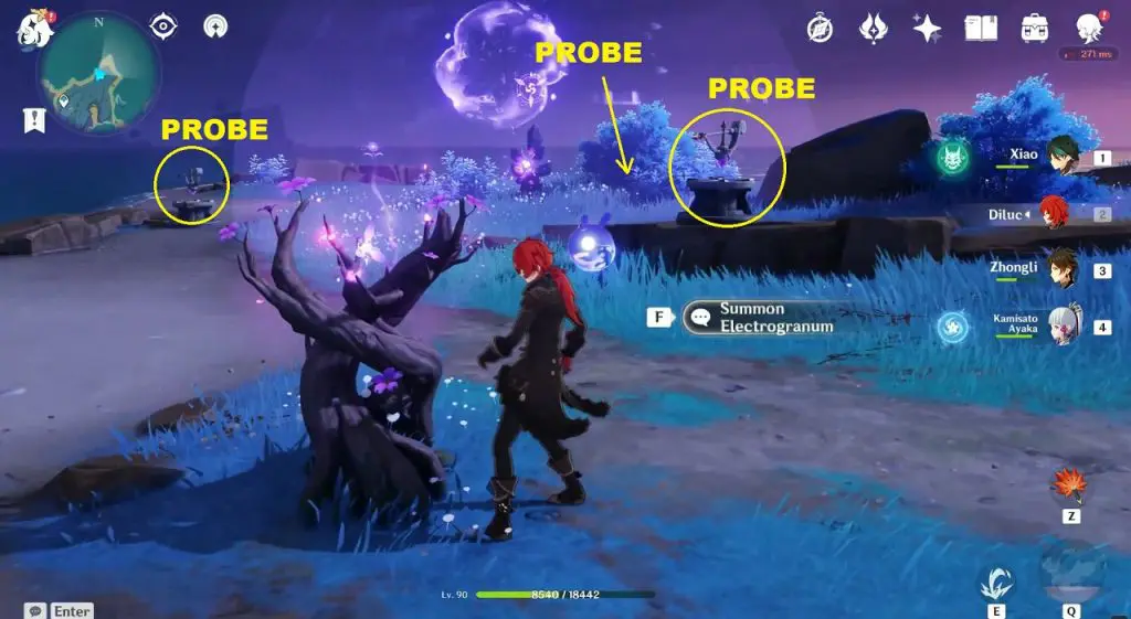 There is a 3-Probe puzzle on the beach near the Seiraimaru ship. To the west of the ship, you will find an electrogranum as shown in the picture below. Get electro charge by summoning electrogranum from the plant and then activate the three probes. One of the probes is hidden behind the bushes as shown in the second and third pictures below. On completing the puzzle an exquisite chest will spawn.