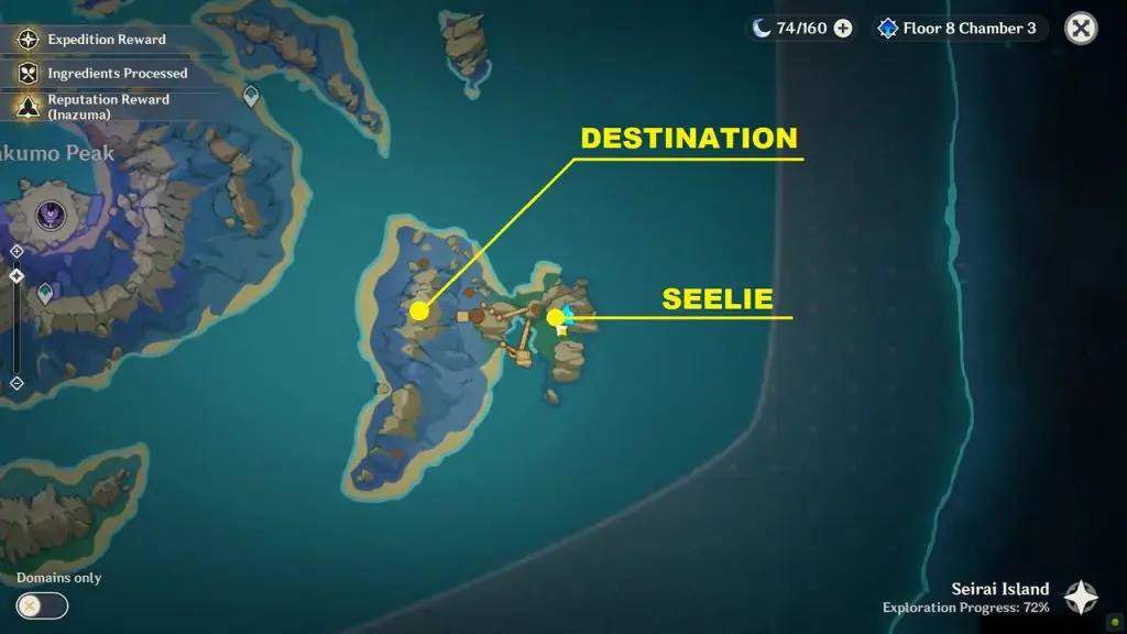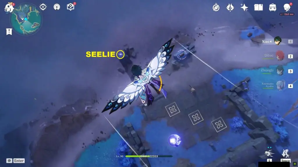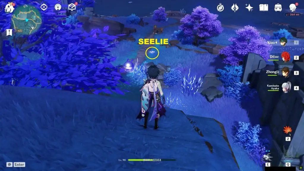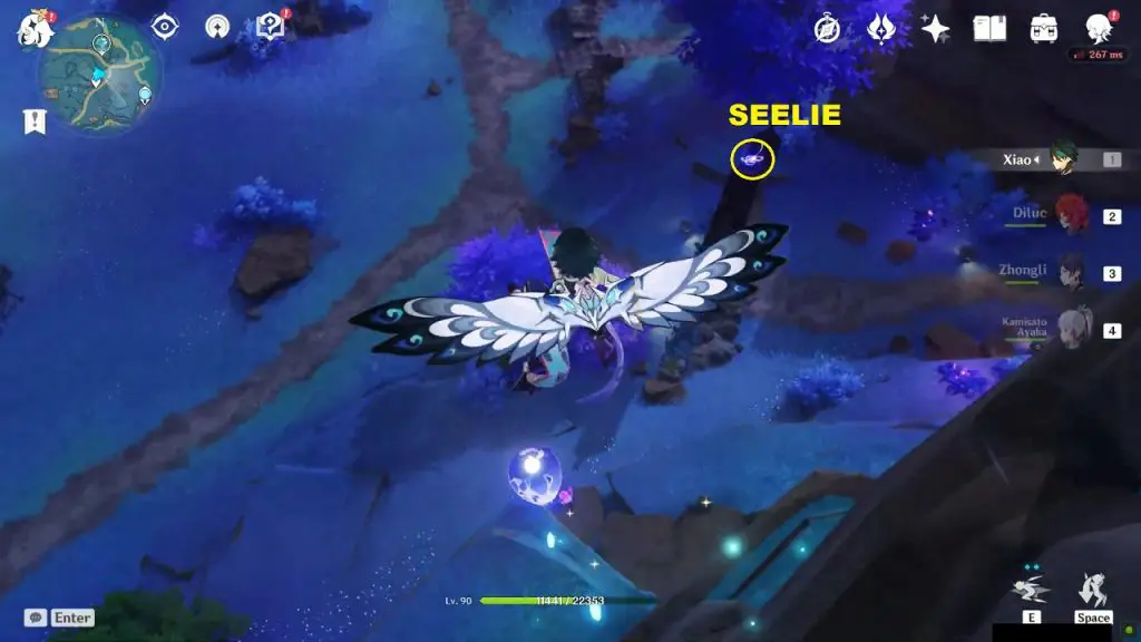 The Seelie is on the southmost islet in Serai Island at the location as shown in the pictures below. As you chase the Seelie, it will go up on a floating rock up in the air. Use electrogranum to reach the Seelie. Now it will go up on even a higher floating rock, which is also its destination. Drop down to the Electrogranum plant that you used before. Now again summon Electrogranum from the same plant and use it to reach where the Seelie is. You will get a common chest there.